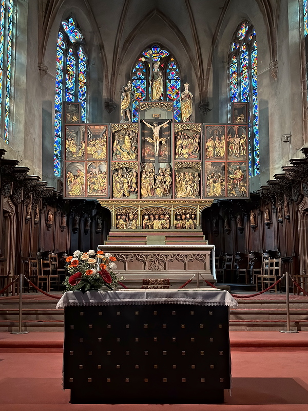 L’église abrite en son chœur un remarquable retable en bois doré représentant les scènes de la Passion, datant de 1518, réalisé par Hans Bongart, le sculpteur de la fontaine de Constantin.