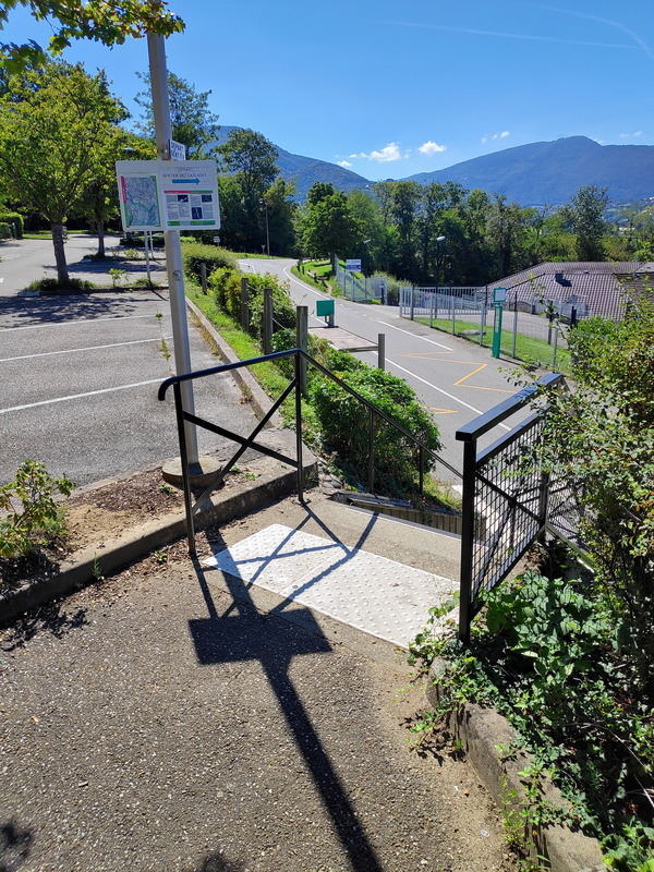 Une fois arrivés à proximité de mairie, traversez le passage piéton car le trottoir s’arrête. Puis longez le parking devant la mairie jusqu’à l’escalier, à coté duquel un panneau indique la direction du sentier des cascades.