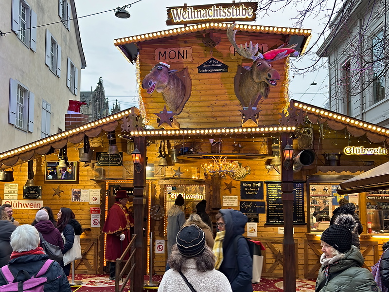 Vous découvrirez aussi sur la Barfüsserplatz et dans les rues autour, des chalets insolites. Par exemple le chalet-bistro Weihnachtsstube, qui possède sur sa devanture deux élans, chantant des chansons de Noël.