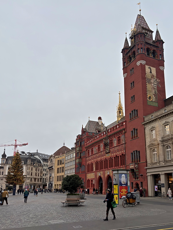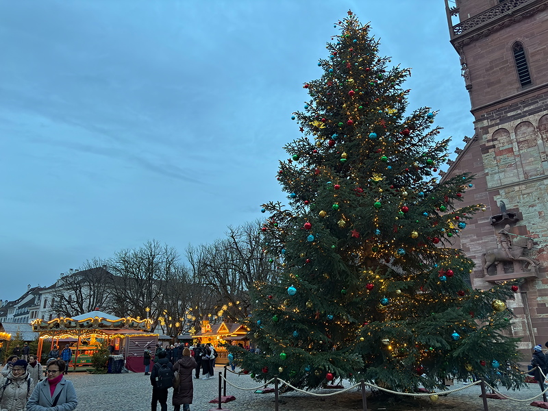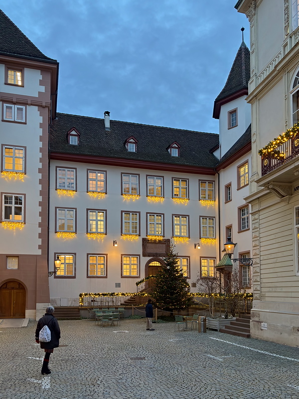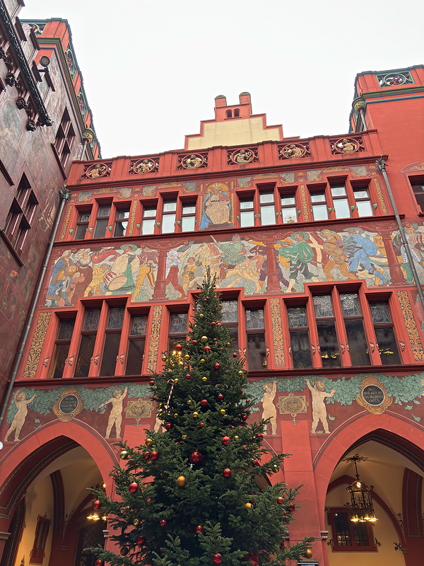 L’autre immanquable à voir lors de la période de Noël à Bâle est la Marktplatz, grande place où se trouve un sapin de Noël, face au splendide Hôtel de Ville de Bâle. En entrant dans la cour intérieure de cet hôtel de ville vous trouverez un autre sapin, qui s’illumine le soir, avec un spectacle de son et lumière projeté sur les murs de la cour intérieure.