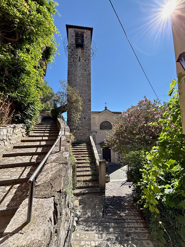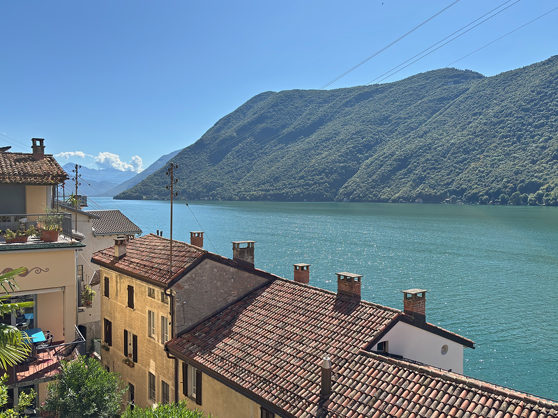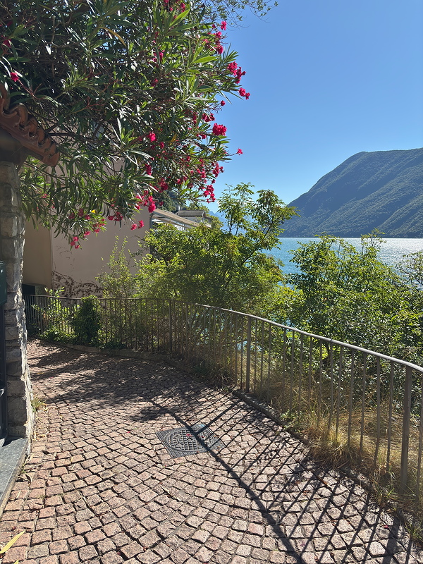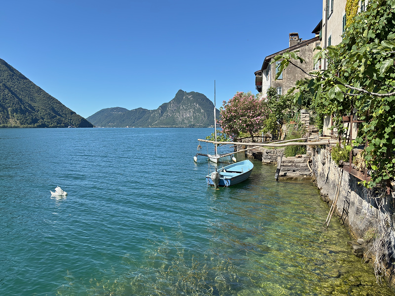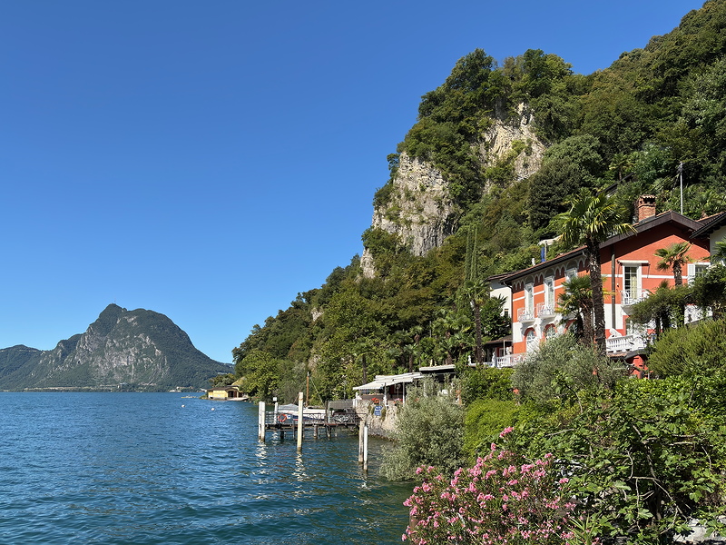 Au bout du sentier, vous atteindrez le village lacustre de Gandria, village en pente, qui possède de nombreuses ruelles pavées avec de multiples escaliers et qui est ponctué de maisons épousant le relief.